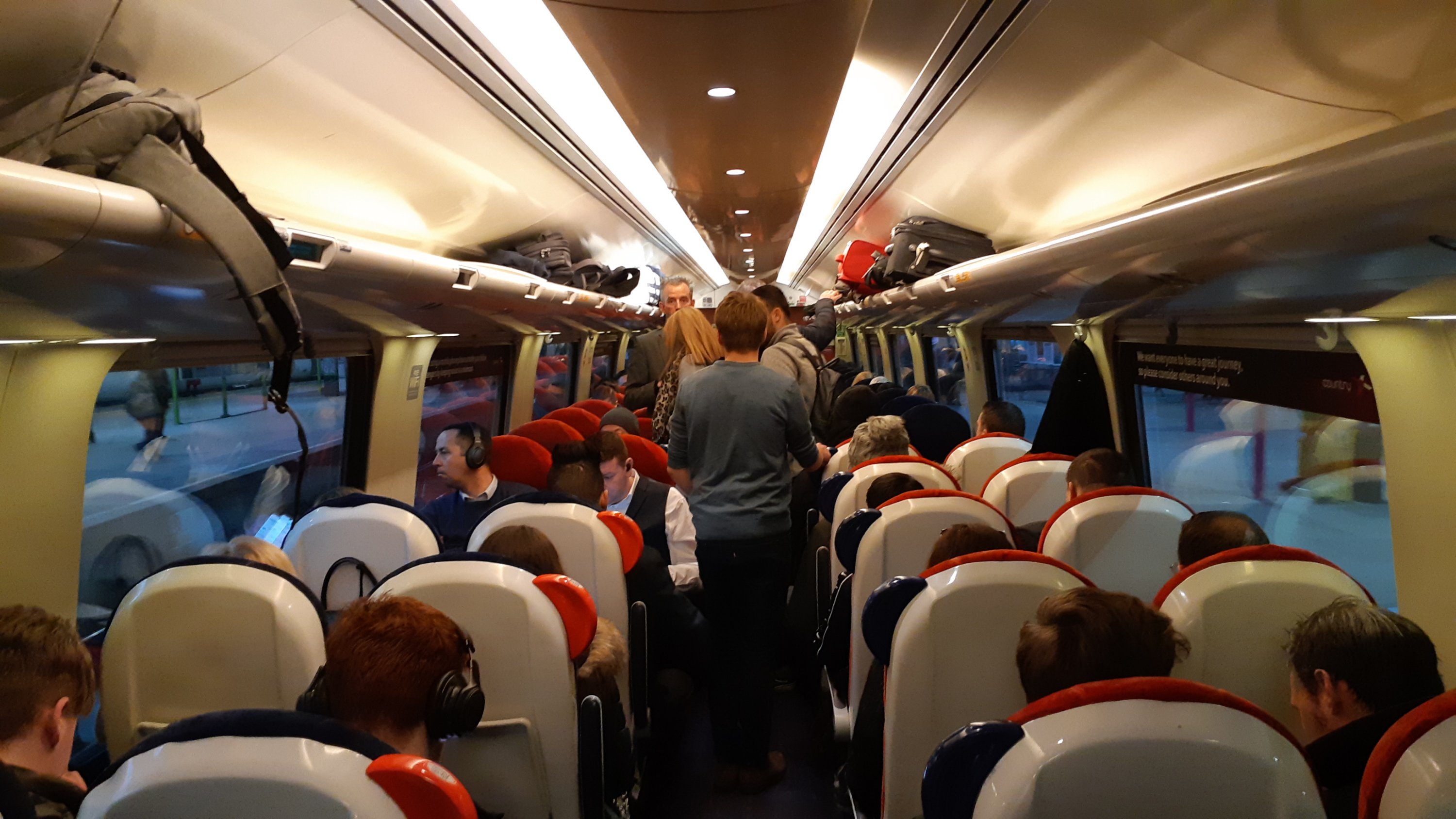 I’m now rammed into the luggage area (formerly the shop) on a 4-car Voyager that’s running 9 mins late due to congestion between York-Leeds. The train’s packed with a mixture of long and short distance passengers. Folk heading down South of Birmingham as far as Plymouth whilst others are taking the short hop from Leeds to Wakefield. It’s one of my dislikes about the Cross-Country network. It’s neither fish nor fowl.