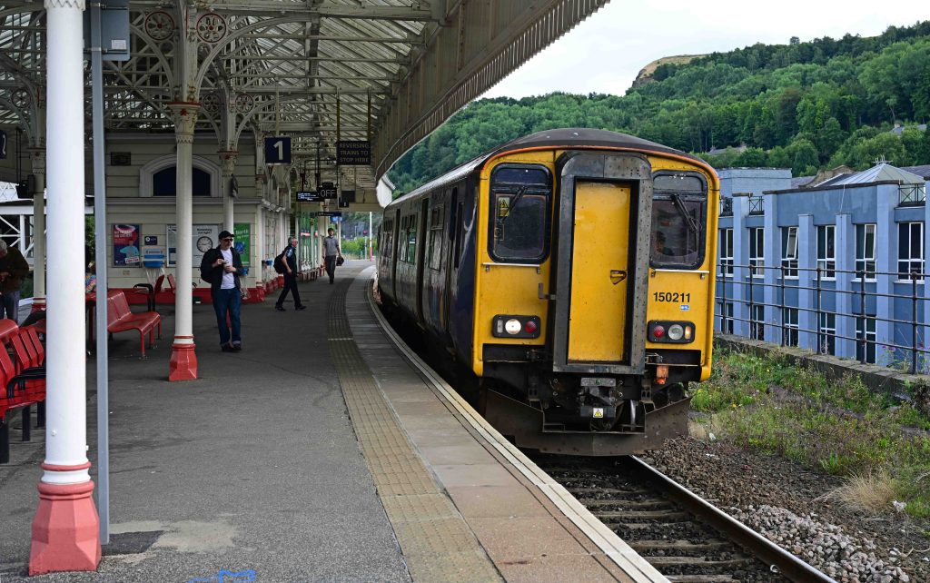 It’s difficult to appreciate how this scene will look in the future – or how it looked in the past. Here’s an artist’s impression curtesy of TRU. Everything here will disappear under a flyover and dive-under! The station will move behind the camera, to the other side of the bridge. The current view from the station platform as workers pour concrete to build one of the retaining walls for the flyover and the line to/from Healy Mills (seen in the background) which will be diverted to pass underneath. A TPE service from York via Healy Mills speeds past workers levelling a fresh pour of concrete.Retaining walls for the new flyover are beginning to rise. The existing main line towards Dewsbury curves away in the distance whilst cranes are at work constructing the bridges for the new line. This section of track will be abandoned once the new lines open. To the left of the picture is the site of the old goods yard and coal-fired power station which provided a lot of rail traffic in the past. Here’s a 1937 map (published in 1942) showing the mass of freight lines and sidings that existed in the area. Ravensthorpe station is bottom left. The very first of the Class 150s, 150001 arrived to take me back to Dewsbury for my connecting train to Halifax. The station will close from the start of the new timetable on Sunday 14 December 2025, so if you want to visit – be quick!