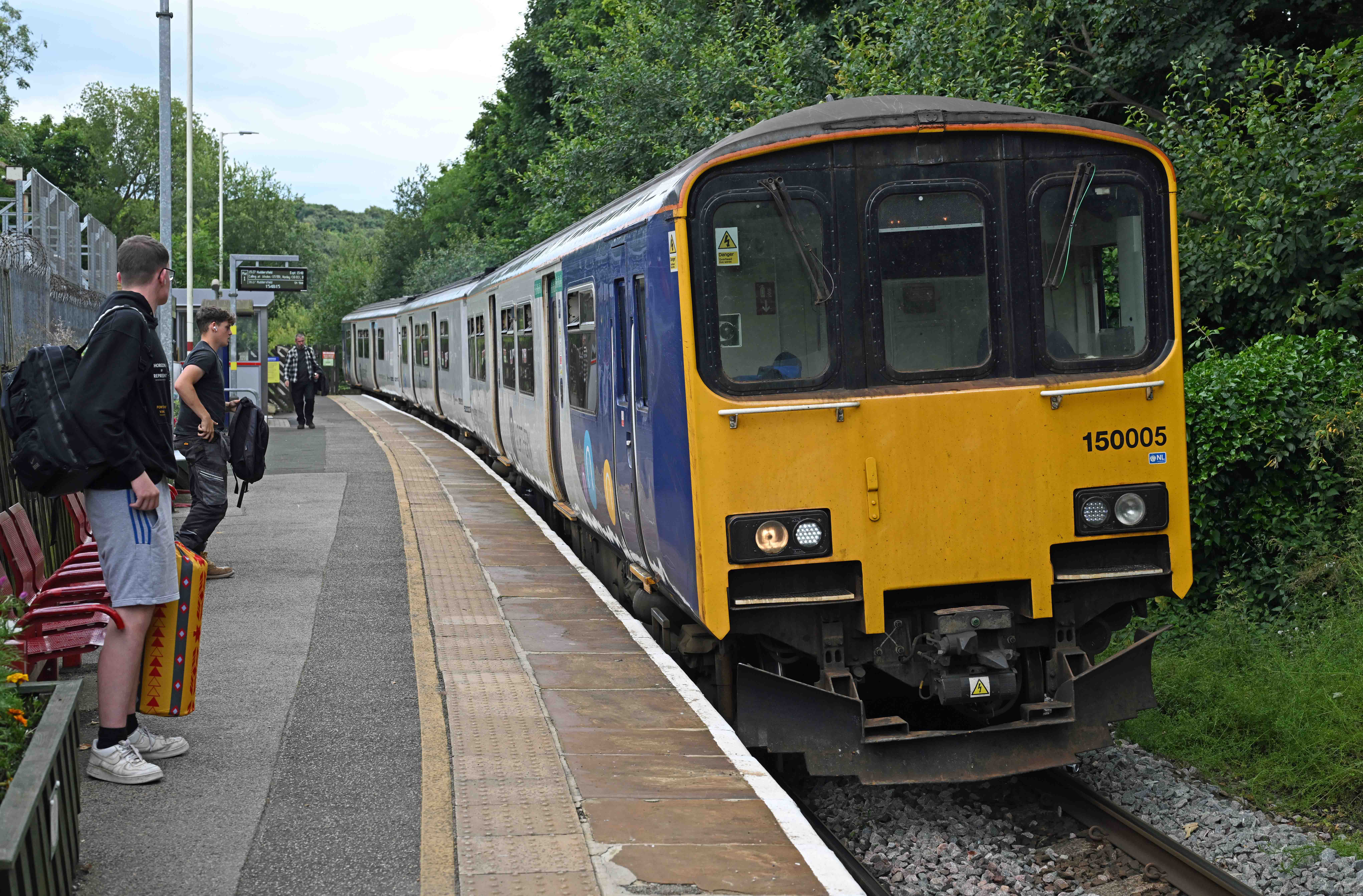 Better late than never! 150005 working 2B58, the 14:35 Sheffield to Huddersfield arrives at Denby Dale 22 minutes late. The service left Sheffield 11 down and lost more time en-route.