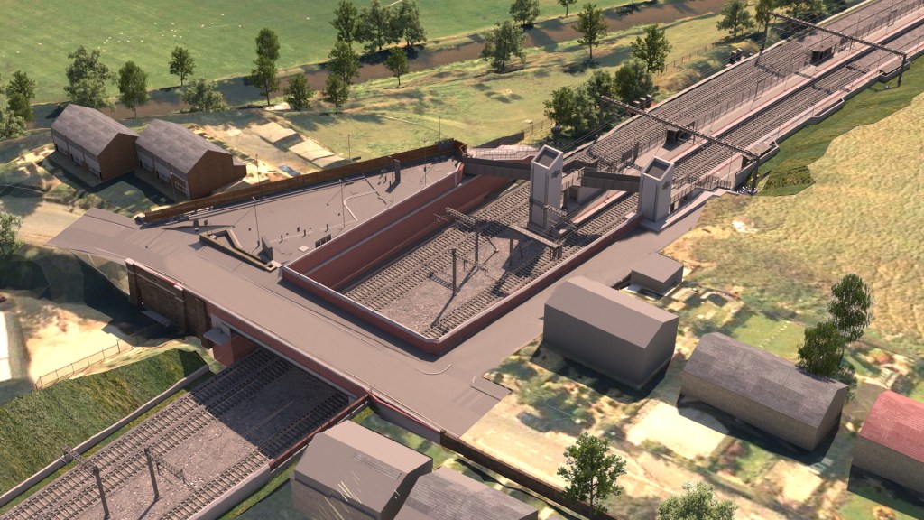 Here’s the view from a local (renewed) footbridge to the West of Deighton looking back to the station. The embankment around the station’s gradually being stripped back to make room for the relocated platforms which will be on the Slow lines, whilst the first part of the new alignments been laid – even though the short length of track’s completely isolated from the current running lines.