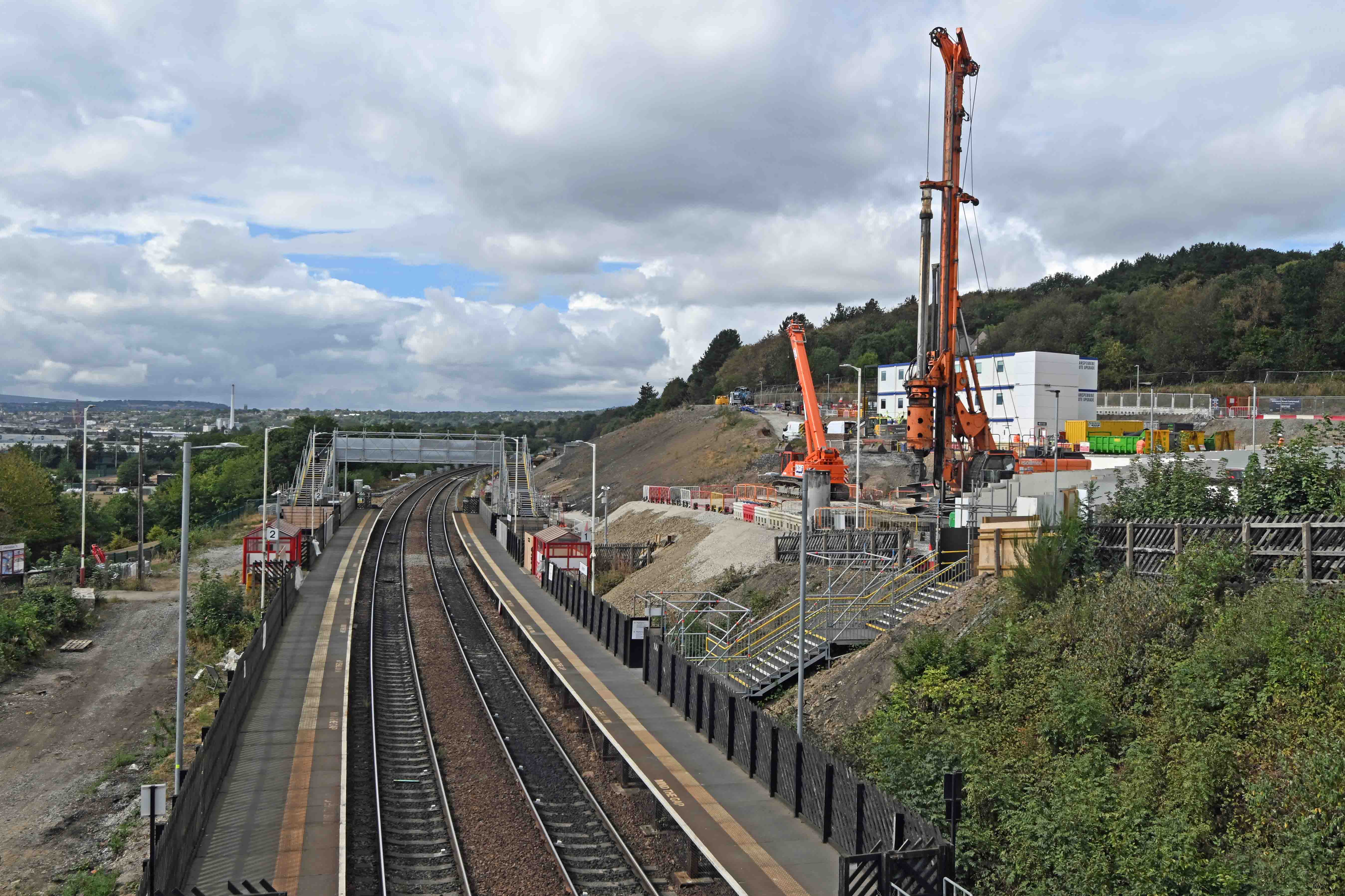 Today would’ve justified a rolling blog but it wasn’t to be as I was moving around too much and at short notice. I’d intended staying at home but the weather picked up and Dawn had an appointment over in Marsden, so I thought ‘why not’? and hitched a lift over to the Colne valley where I could catch a train Eastwards to have a look at progress on the Trans-Pennine Route Upgrade (TRU) around Deighton. There’s some major civil engineering going on here to allow four-tracking to be reinstated and the station to be relocated.